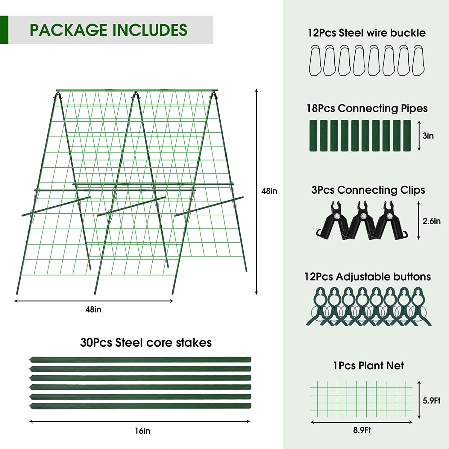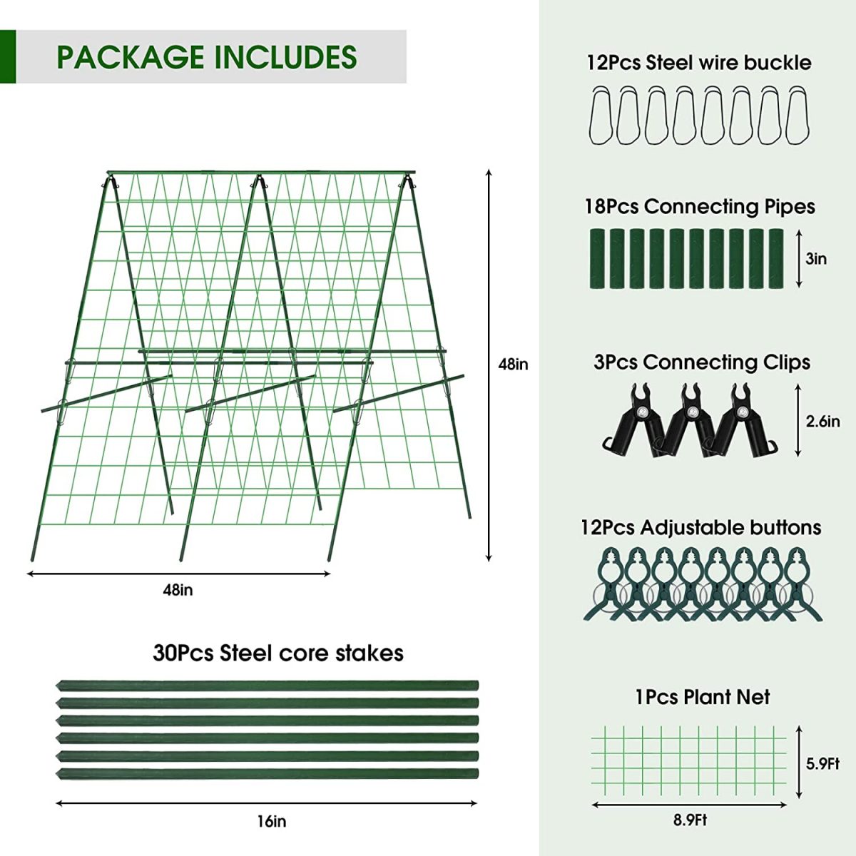 • 【Package Includes】30 x Steel core stakes,18 x connecting Pipes,12Pcs adjustable buttons, 12Pcs steel wire buckle, 3Pcs connecting clips, 1 x trellis netting. The manual is attached, and you can assemble according to the manual.
