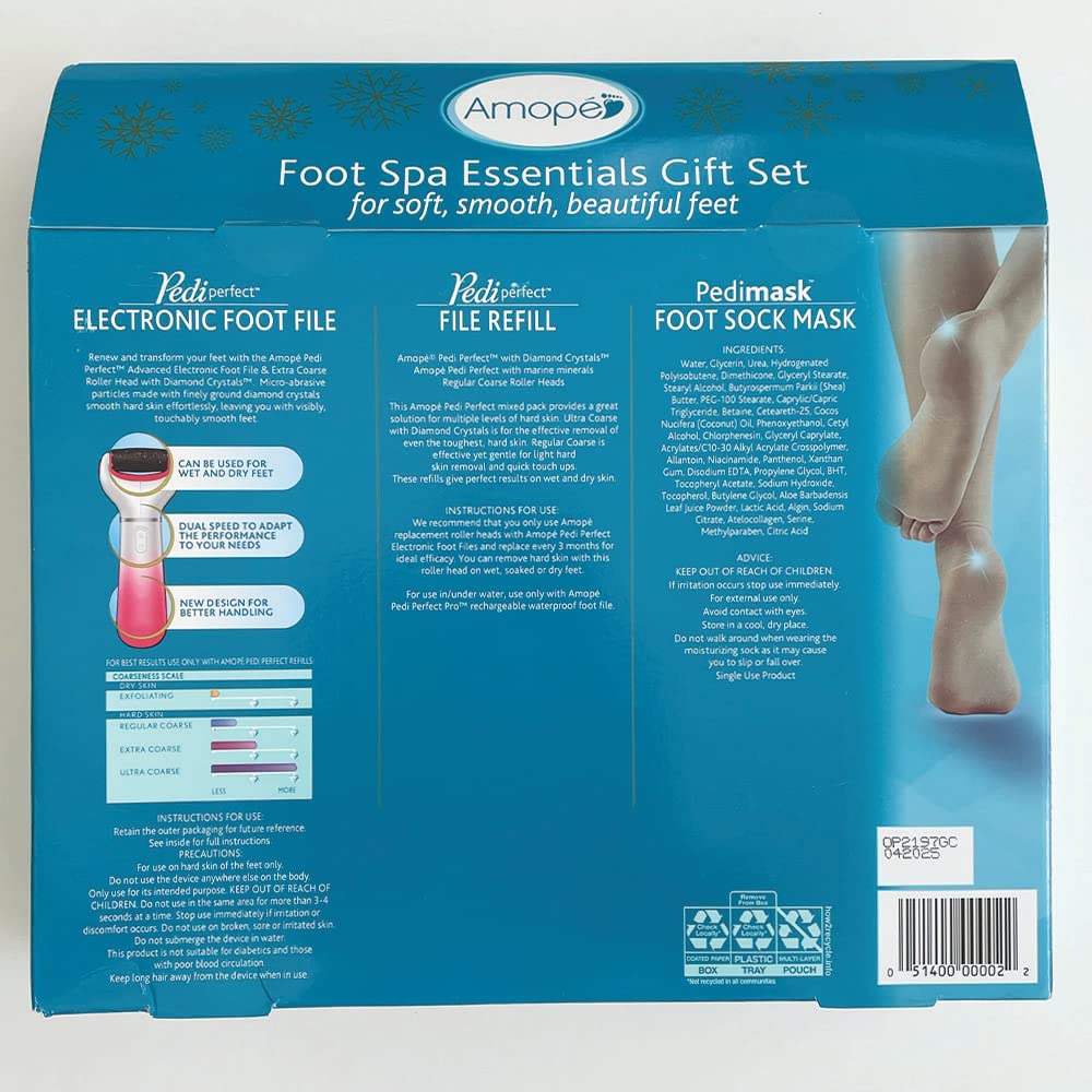• Renew and transform your feet with the AmopĂ© Pedi Perfect Advanced Electronic Foot File. This foot file is the ultimate pedicure tool for a great foot spa experience at home.