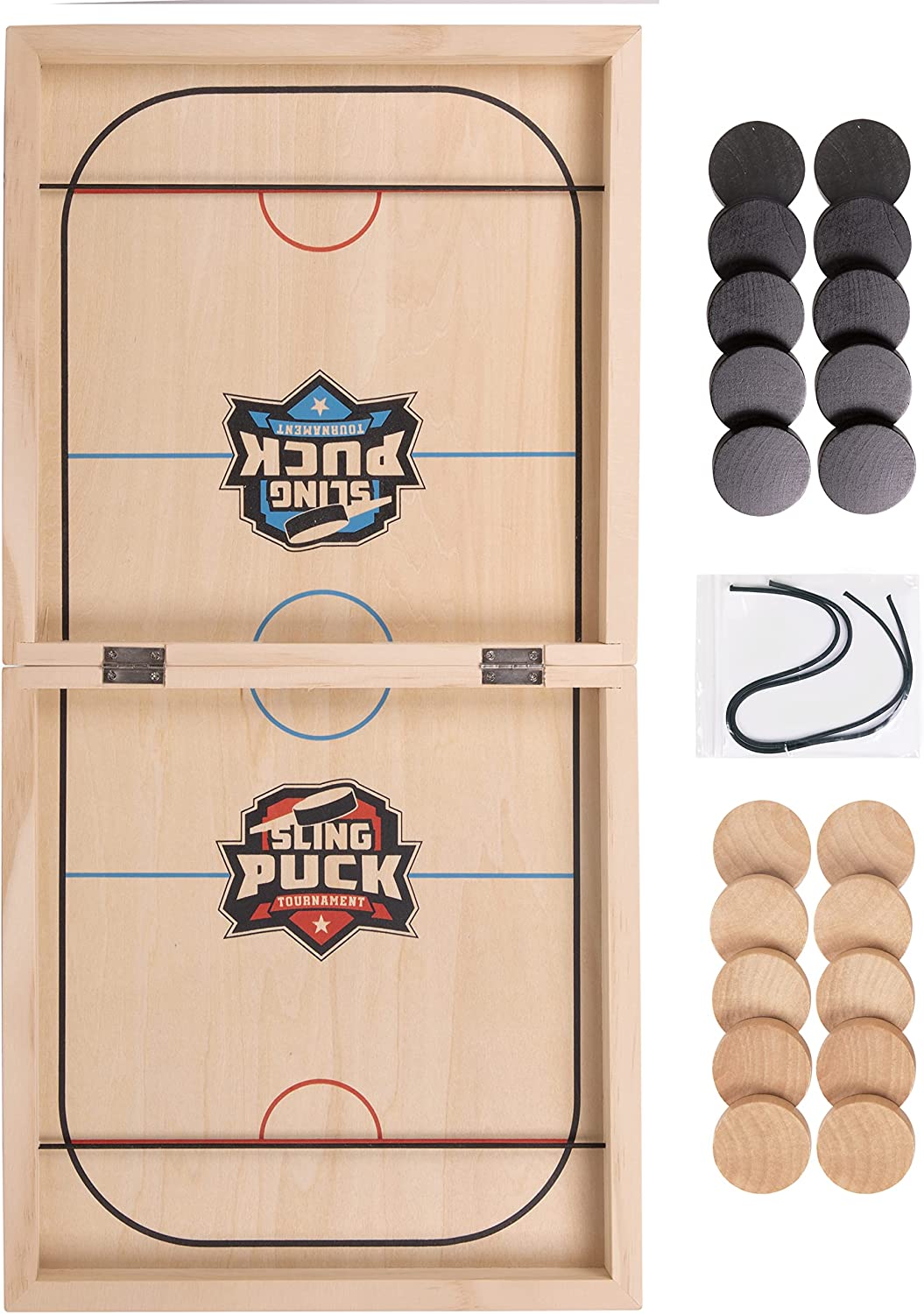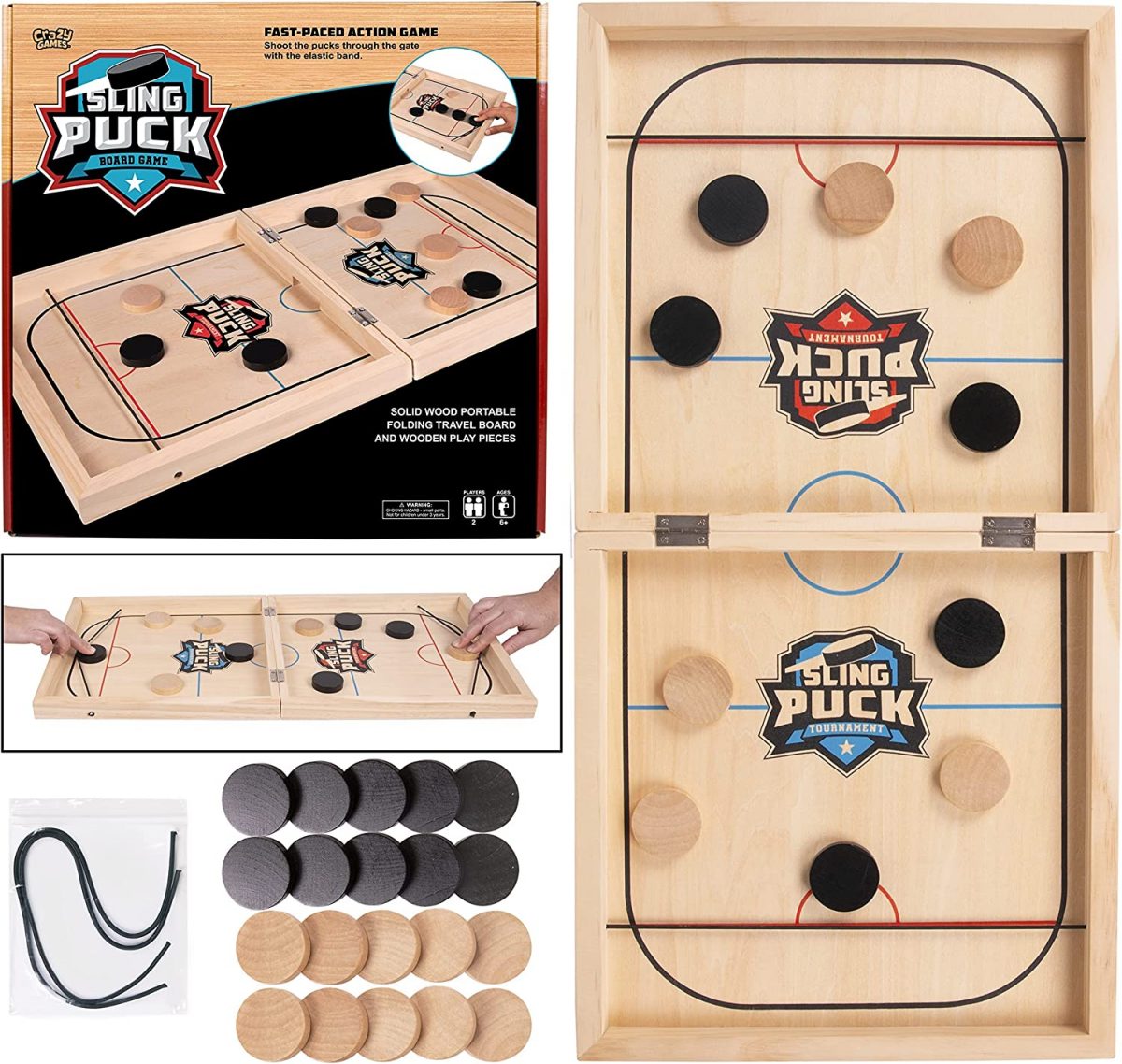 • WHAT YOU GET : Our package includes One foldable board game table with 4 elastic bands ( 2 replacements) & 20 puck pieces ( 10 black & 10 natural ).This fast sling puck game is the ideal interactive portable entertainment for everyone; you can play it with your friends, family, or relatives. Due to sling puck game compact size & light in weight, the puck game can be played on a table or on the floor, or carry it on picnic. It’s a hilarious family wooden fast track board game.