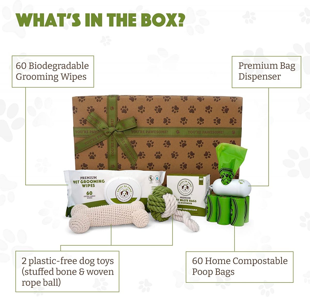 • Dog Essentials in a Cute Gift Box: 2 plastic-free dog toys, including a stuffed bone and woven rope ball, 60 vegetable-based poop bags, and 60 bamboo grooming wipes; each box comes tied with a bow, ready to give to a new dog owner or experienced pet parent