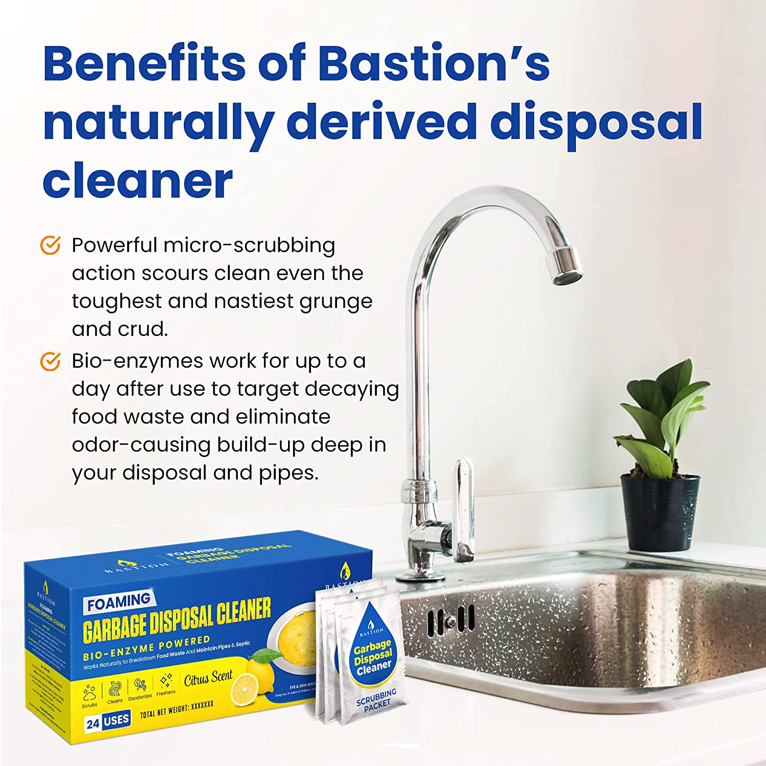 • EASY TO USE: Bastion Foaming Garbage Disposal Packets are simple to use. Just (1) run your disposal with hot water, (2) Turn off disposal and reduce water to a thin stream, (3) drop in one Bastion Garbage Disposal Scrubbing Packet and turn on disposal for 15 seconds to enjoy a clean and fresh smelling kitchen. Use weekly for best results.