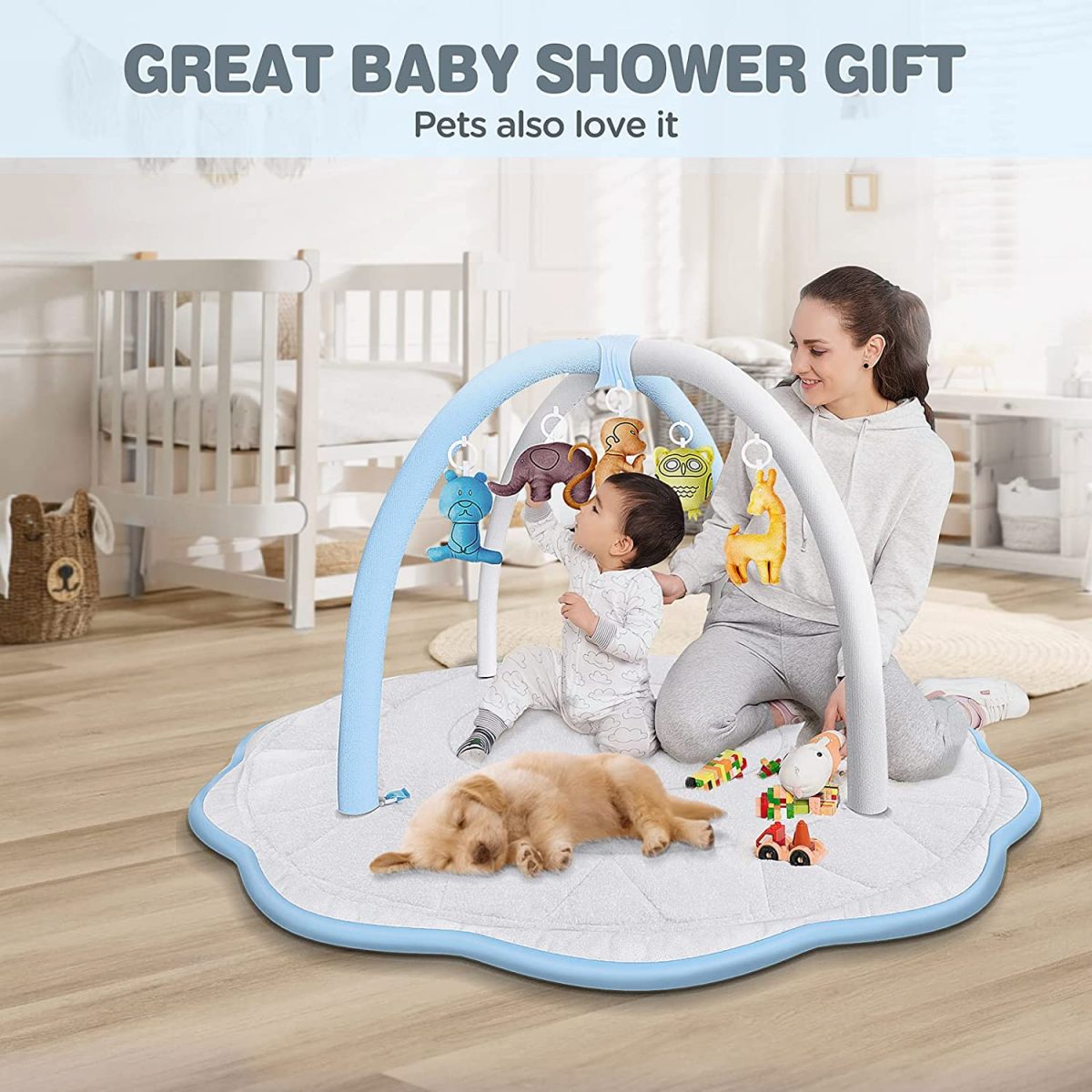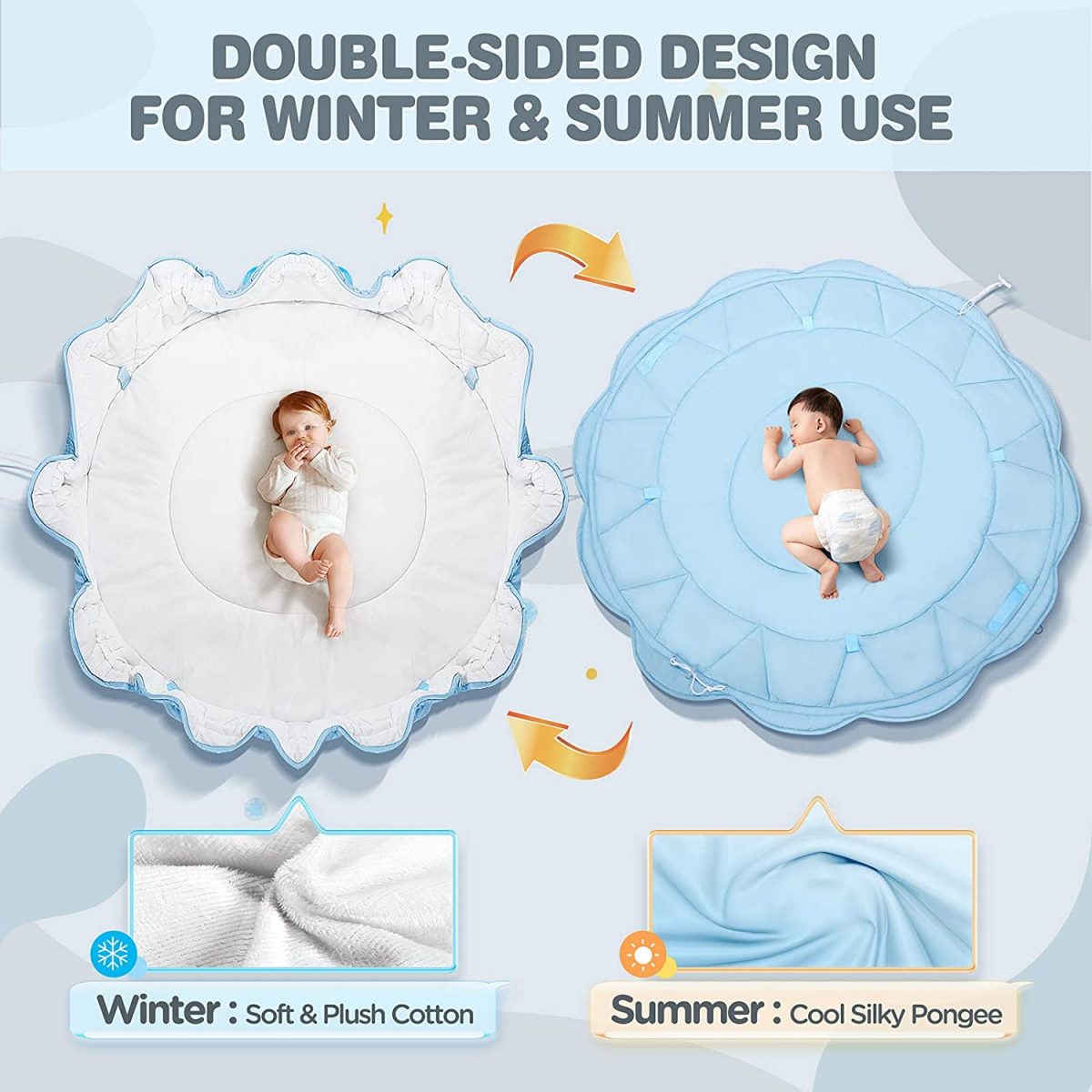 • Thick Even Padding, Double-sided Design with Different Premium Cloths for Winter & Summer Using – The baby activity gym is made of plush fabrics, pongee, and thick enough cotton padding. Double-sided winter and summer use design allows babies to lay cozily on the soft plush baby gym for tummy time. Additionally, the unique circular stitching in the middle makes the even stuffing not easy to lump.