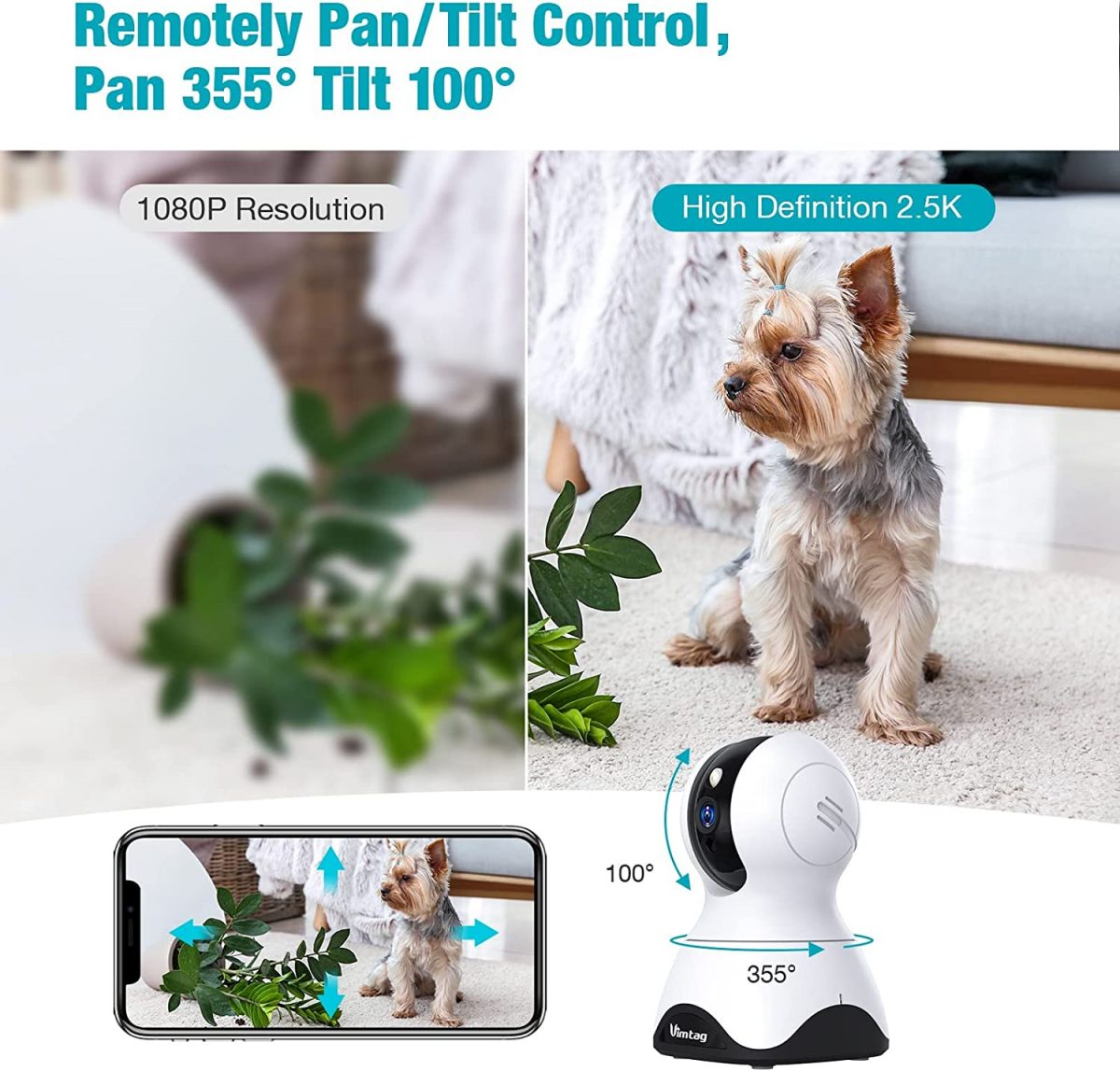 • 【Full 2.5K HD and 355° Pan/Tilt】: The Vimtag pet camera provides 8X optical zoom, 2.5K HD crystal clear smooth live video with 355° horizontal and 100° vertical rotation range, covering every corner of your home,monitor your pets, baby all the time . Dog Camera works with 2.4G WiFi.